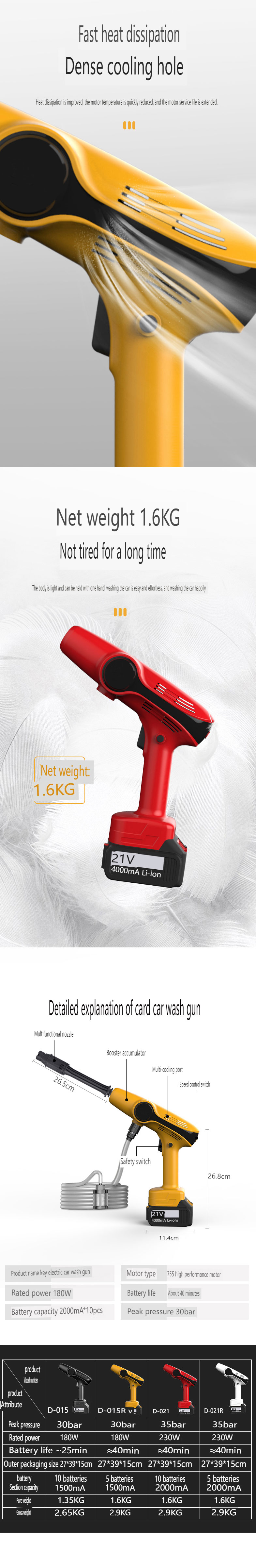 Features: 1. Cordless for use, one charge for 25mins car washing. 2. Self-priming design, convenient for water supply. 3. 1700Kpa high-pressure jet, strong flushing. 4. Adjustable water spray, wide application.
